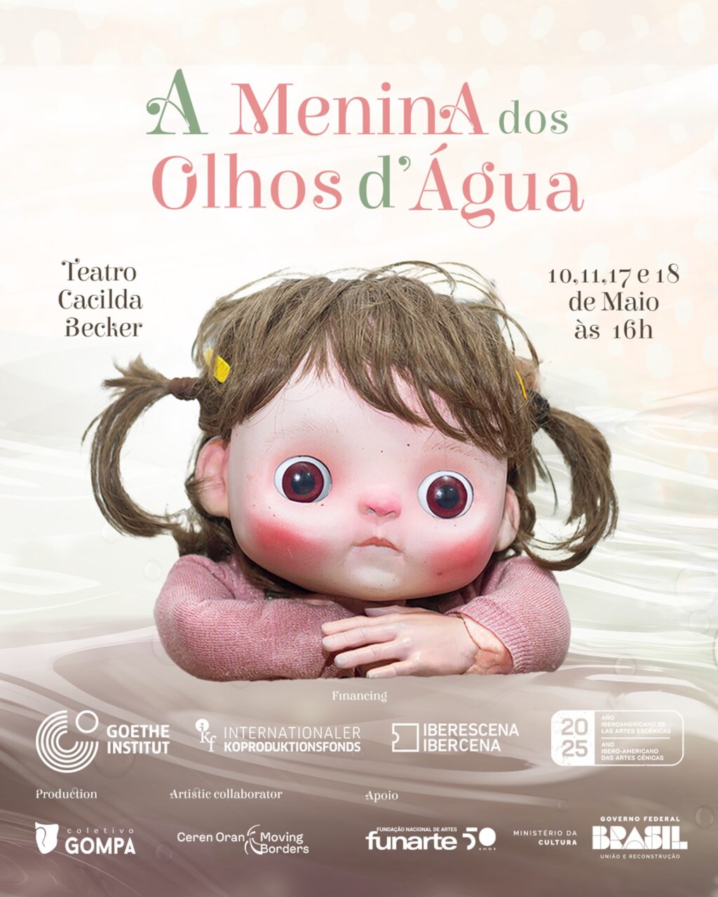 A Menina dos Olhos d’Água retrata, de forma lúdica,a situação dos refugiados climáticos e a superação de uma pequena menina, representada por uma boneca, diante de catástrofes ambientais. Produzida pelo Coletivo Gompa, de Porto Alegre, a montagem foi contemplada com o Prêmio IKF (International Coproduction Fund) do Goethe-Institut e Iberescena.As primeiras apresentações da peça aconteceram em Munique, na Alemanha, nos dias 11 e 12 de abril, e a estreia brasileira será no Rio de Janeiro. Com direção de Camila Bauer e atuação de Liane Venturella, a produção estará em cartaz de 10 a 18 de maio, aos sábados e domingos, às 16h, no Teatro Cacilda Becker (Rua do Catete, 338 — Catete). Os ingressos custam de R$ 22,00 a R$ 44,00 e estão à venda na plataforma Sympla.