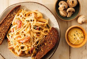 Uma combinação perfeita de camarões e champignons, temperada com ervas finas e servida com fettuccine refogada ao molho Alfredo.