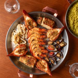 Indescritível prazer do mar nordestino. Lagosta, camarões, mexilhões, peixe e lula grelhados com molho provençal. Acompanha arroz de açafrão com parmesão.