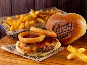 Hambúrguer angus 150g, bacon, onion rings, queijo cheddar e molho Smoke House Barbecue Ranch, no pão brioche. Acompanha fritas.