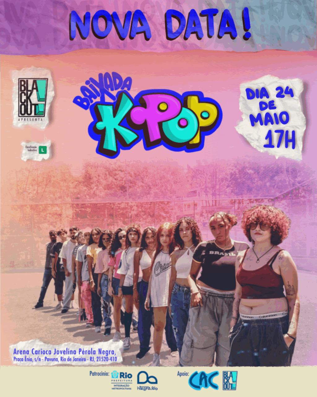 No dia 24 de maio de 2025, a Arena Jovelina Pérola Negra, na Pavuna, será palco do espetáculo “Baixada K-pop”, promovido pelo grupo BLACKOUT. Com entrada gratuita e classificação livre, o evento promete celebrar a energia vibrante da cultura coreana em uma apresentação cheia de emoção e com um olhar muito pessoal do grupo de dança, que mesclam a estética coreana com um toque especial da periferia carioca.