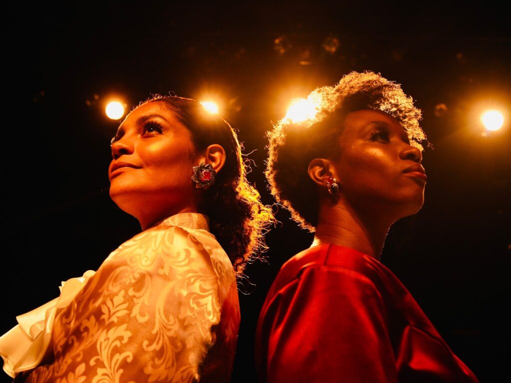 Os anos foram passando, e o tempo e as agendas atribuladas dos três não ajudaram, mas ali foi plantada a semente que agora finalmente germina potente no palco. No espetáculo, cujo cenário de Lorena Lima remete a um estúdio de cinema, duas atrizes, Zezé e Elisa — em homenagem a Zezé Motta e Elisa Lucinda —, se encontram para o primeiro dia de ensaio de um filme musical sobre as vidas de Ruth de Souza e Léa Garcia, respectivamente, Bárbara Reis e Ivy Souza. Enquanto se preparam, com figurinos assinados por Rute Alves, – que se inspirou na obra do falecido escultor Emanoel Araújo, curador e fundador do Museu AfroBrasil, muito amigo de Ruth e Léa – e sob a luz de Gustavo e Marcelo Andrade, elas refletem sobre as trajetórias dessas duas icônicas atrizes e compartilham seus desejos, anseios e realizações. Este encontro, em busca de respostas, é testemunhado por Gláucia Negreiros, pianista do espetáculo.