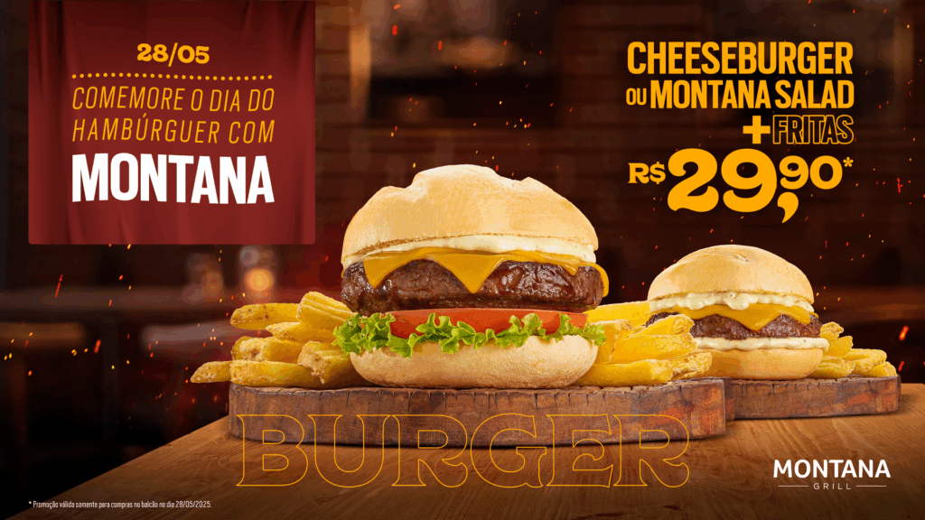 Maio, 2025 – O Dia do Hambúrguer será comemorado nesta quarta-feira (28) e o Montana Grill, rede especializada em cortes selecionados de carne da Halipar (Holding de Alimentação e Participações), vai celebrar a data com duas opções de sua linha de burgers com preço promocional. O “Montana Cheeseburger” e o “Montana Salad”, ambos acompanhados de fritas e maionese especial, serão vendidos por R$ 29,90 somente neste dia.