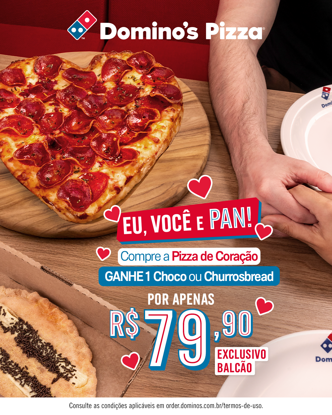 Para tornar o Dia dos Namorados ainda mais especial, a Domino’s preparou uma promoção cheia de sabor e carinho. Entre 9 e 15 de junho, ao pedir uma pizza pan – aquela com massa aerada, dupla camada de queijo e borda crocante que todo mundo adora – em formato de coração, o cliente recebe de presente um churrosbread ou um chocobread. A ação é exclusiva para pedidos feitos diretamente no balcão.