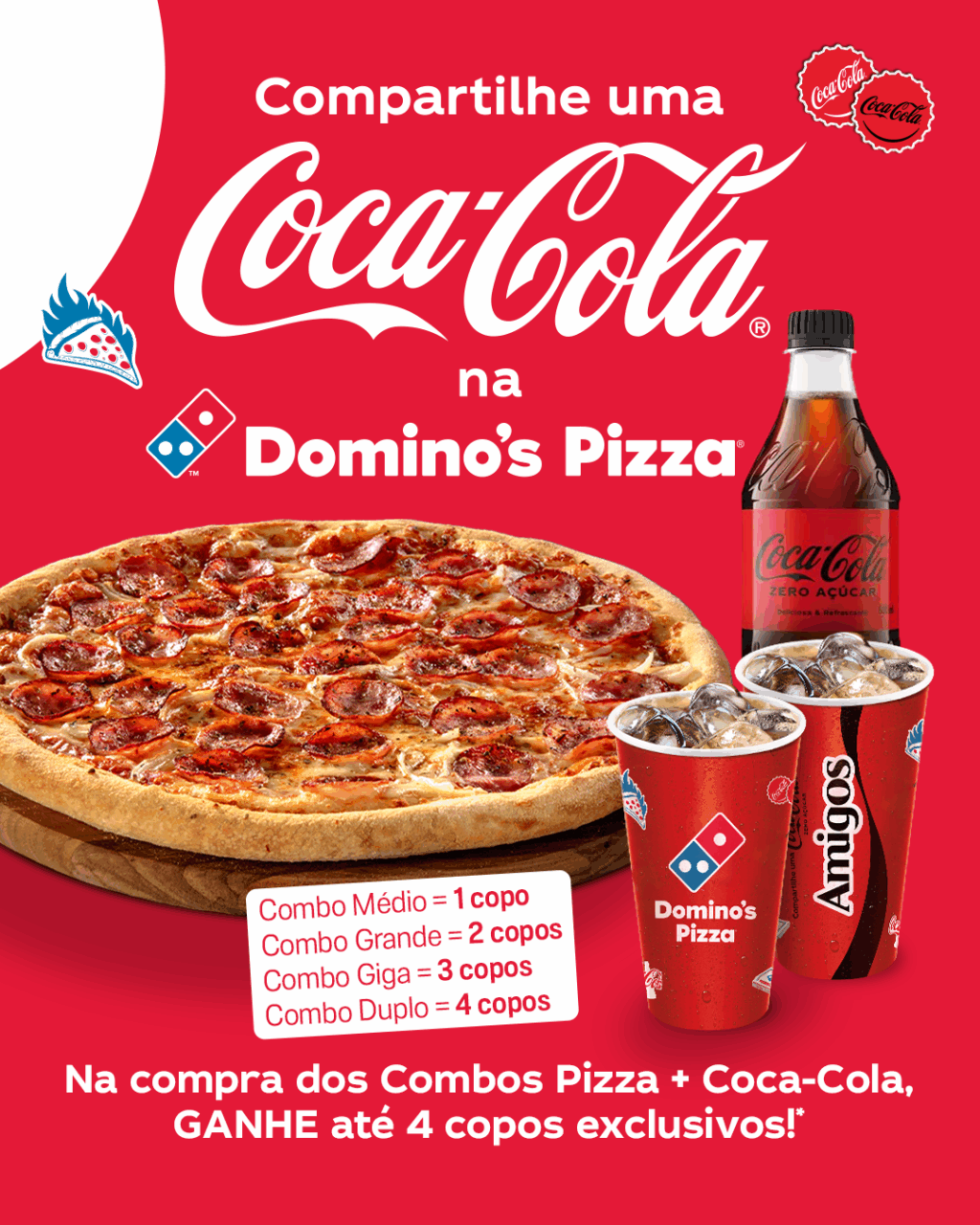 Tem coisa melhor do que dividir uma pizza quentinha e deliciosa da Domino’s e uma coquinha gelada com quem a gente gosta? A maior rede de pizzarias do mundo entrou de vez nessa vibe e se juntou à Coca-Cola na campanha “Share a Coke” – aquela que traz na latinha nomes e palavras que comemoram laços afetivos. Para marcar a parceria e a amizade com a gigante de refrigerantes, quem pedir combos de pizza com Coca em lojas do Rio de Janeiro e de São Paulo vai ganhar copos colecionáveis com a cara das duas marcas e a palavra “amigos” em destaque.