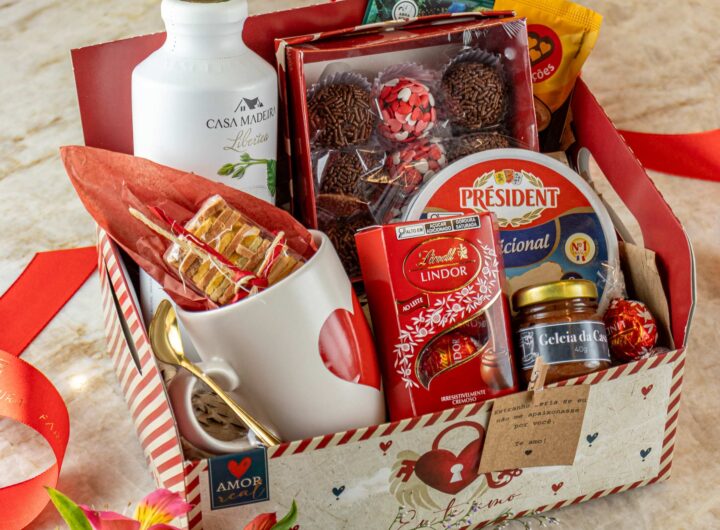 Kits e cestas decoradas incluem bebidas, chocolates, petiscos e até fondue para arrasar na lembrança O Empório Farinha...