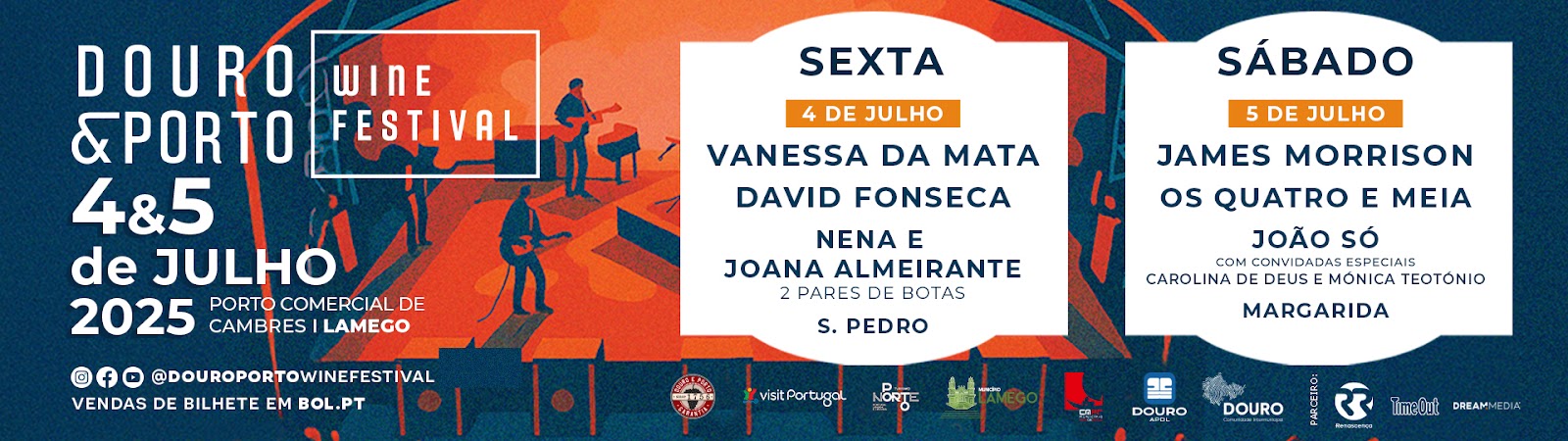 No dia 4 de julho, sexta-feira, o evento terá shows de Vanessa da Mata, David Fonseca, Nena e Joana Almeirante com o projeto ‘2 Pares de Botas’, e S. Pedro. Já no dia 5 de julho, sábado, sobem ao palco James Morrison, Os Quatro e Meia, João Só com as convidadas especiais Carolina de Deus e Mónica Teotónio, e a jovem cantora e compositora de Vila Real Margarida.