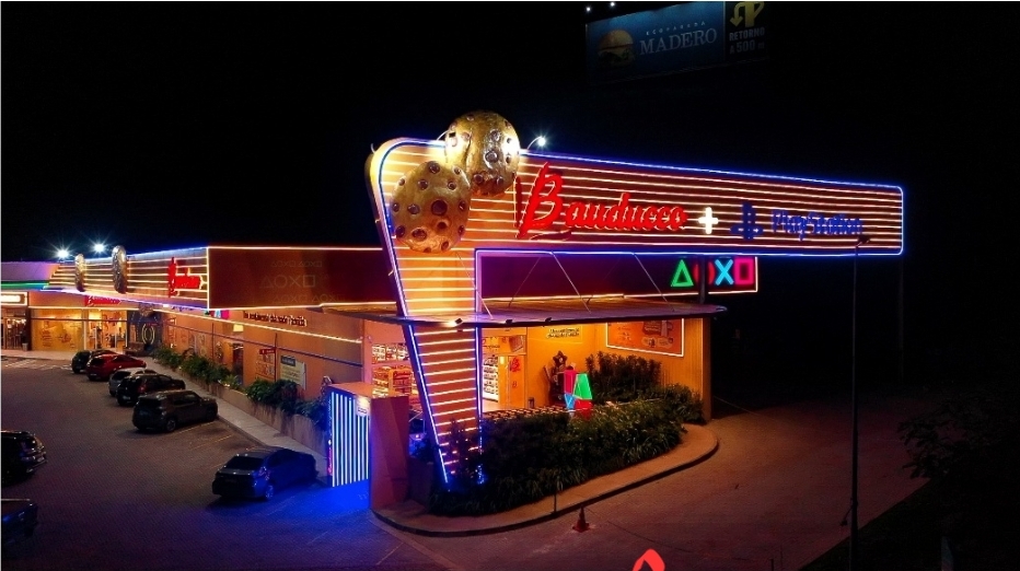 A ativação de brand experience, que fica ainda mais chamativa à noite com seus neons acesos, faz parte da parceria da marca com a PlayStation, referência global em entretenimento digital.