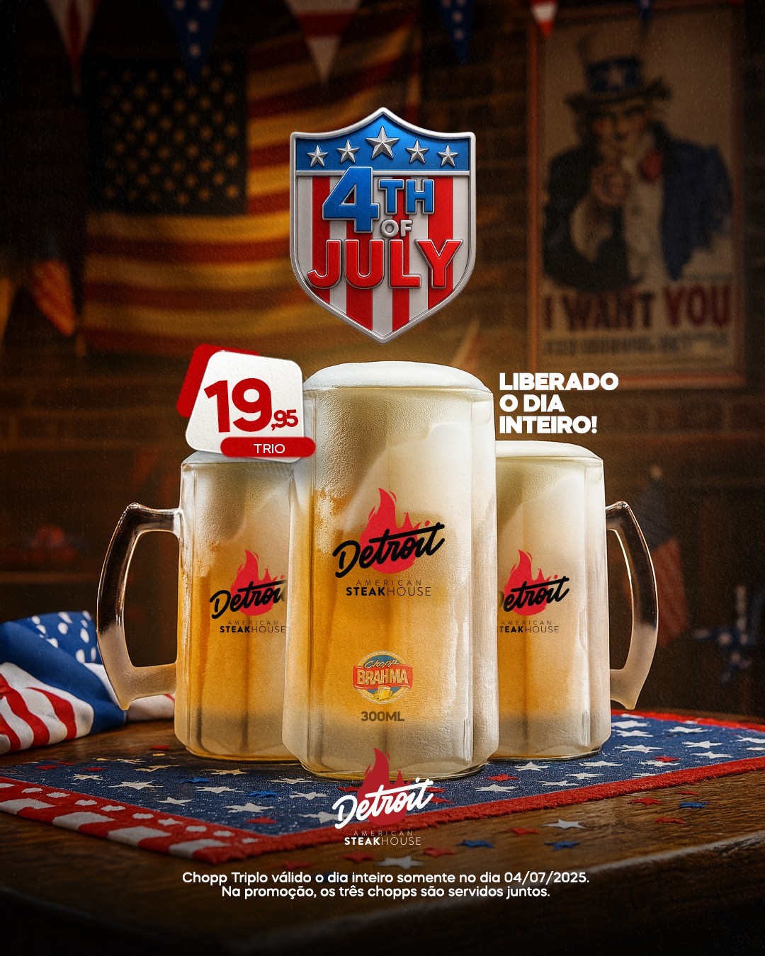 Inspirada na cultura americana, a rede Detroit American Steakhouse comemora o 4 de Julho — Dia da Independência dos Estados Unidos — com uma ação especial em todas as suas unidades no Brasil. Nesta sexta-feira (04/07), os clientes poderão aproveitar Chopp Triplo por apenas R$ 19,95 durante todo o dia, uma liberação excepcional da restrição de horário habitual da promoção, feita especialmente para celebrar uma das datas mais emblemáticas do calendário norte-americano.