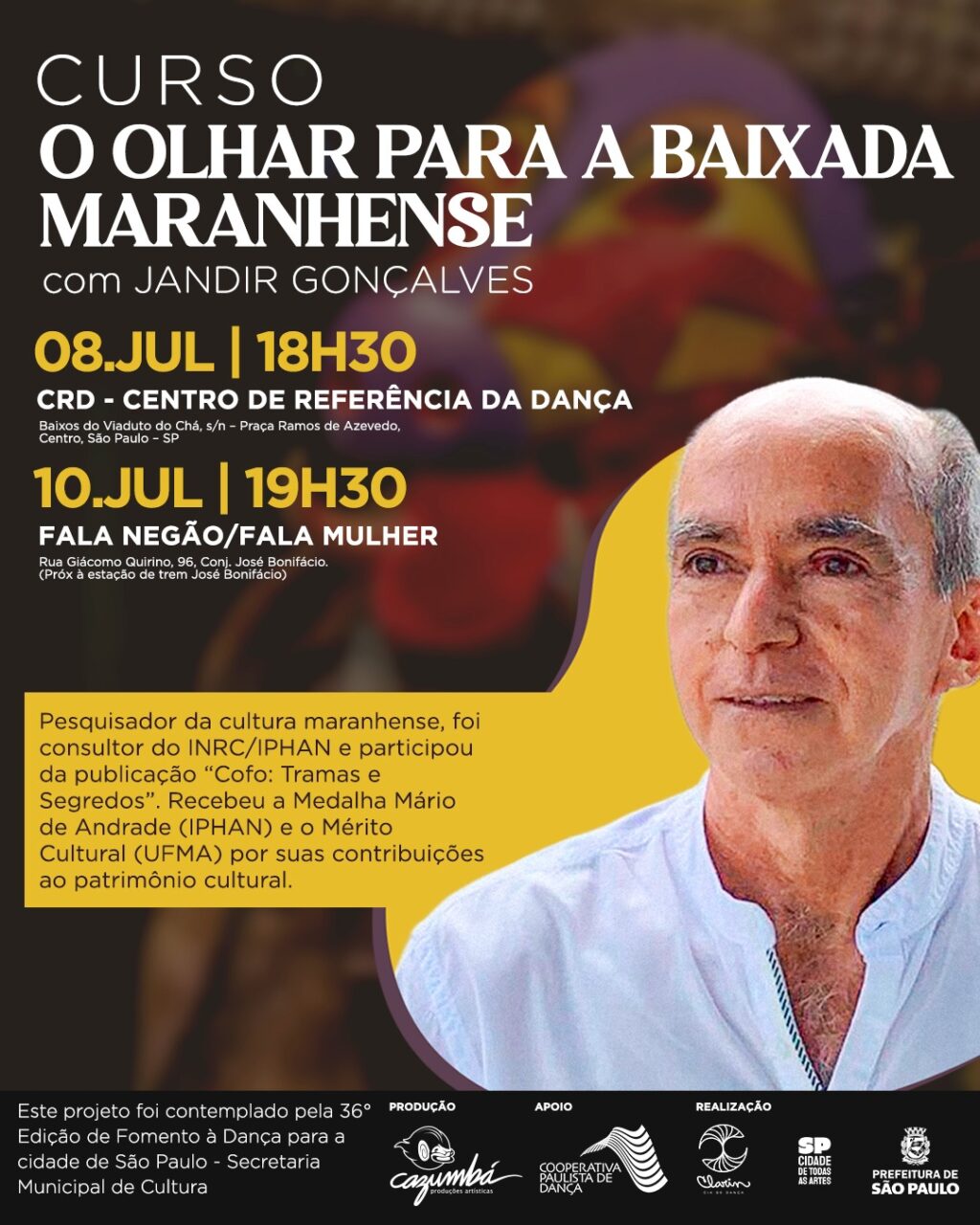 Com uma trajetória marcada pela defesa das expressões populares e pela atuação no Museu Casa de Nhozinho, em São Luís (MA), Jandir Gonçalves conduzirá o curso “Bumba-Meu-Boi da Baixada Maranhense”, como parte do projeto “Terras de Águas e Cazumbas”, contemplado pela 36ª edição do Fomento à Dança da Cidade de São Paulo.