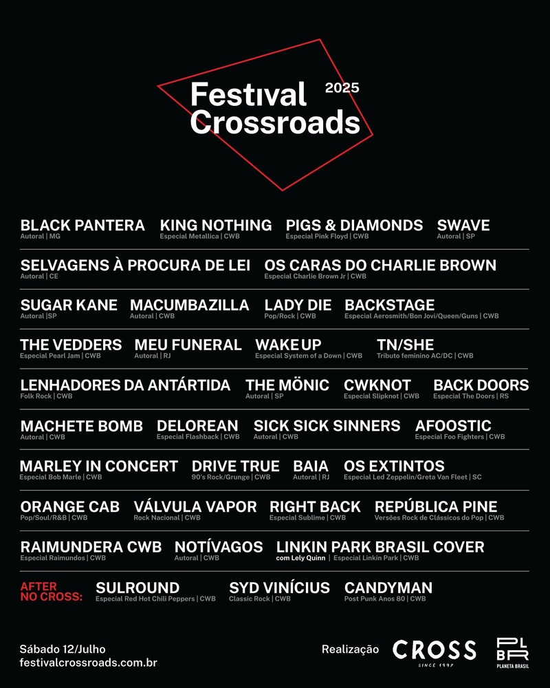 A programação será distribuída ao longo de 12 horas de festival, das 10h às 22h, reunindo shows, encontros e vivências que conectam gerações por meio da música e da liberdade de expressão. O line-up oficial do Festival Crossroads 2025 reúne artistas autorais e tributos consagrados que percorrem diversas vertentes do rock — do alternativo ao clássico, do punk ao progressivo, passando pelo folk, rap-rock e grunge. Entre os nomes confirmados estão as aclamadas Black Pantera, Selvagens à Procura da Lei, Sugar Kane, Machete Bomb, Meu Funeral, Baia, Swave, The Mönic, Notívagos, Sick Sick Sinnerse Macumbazilla, reafirmando o compromisso do festival com a cena autoral brasileira.
