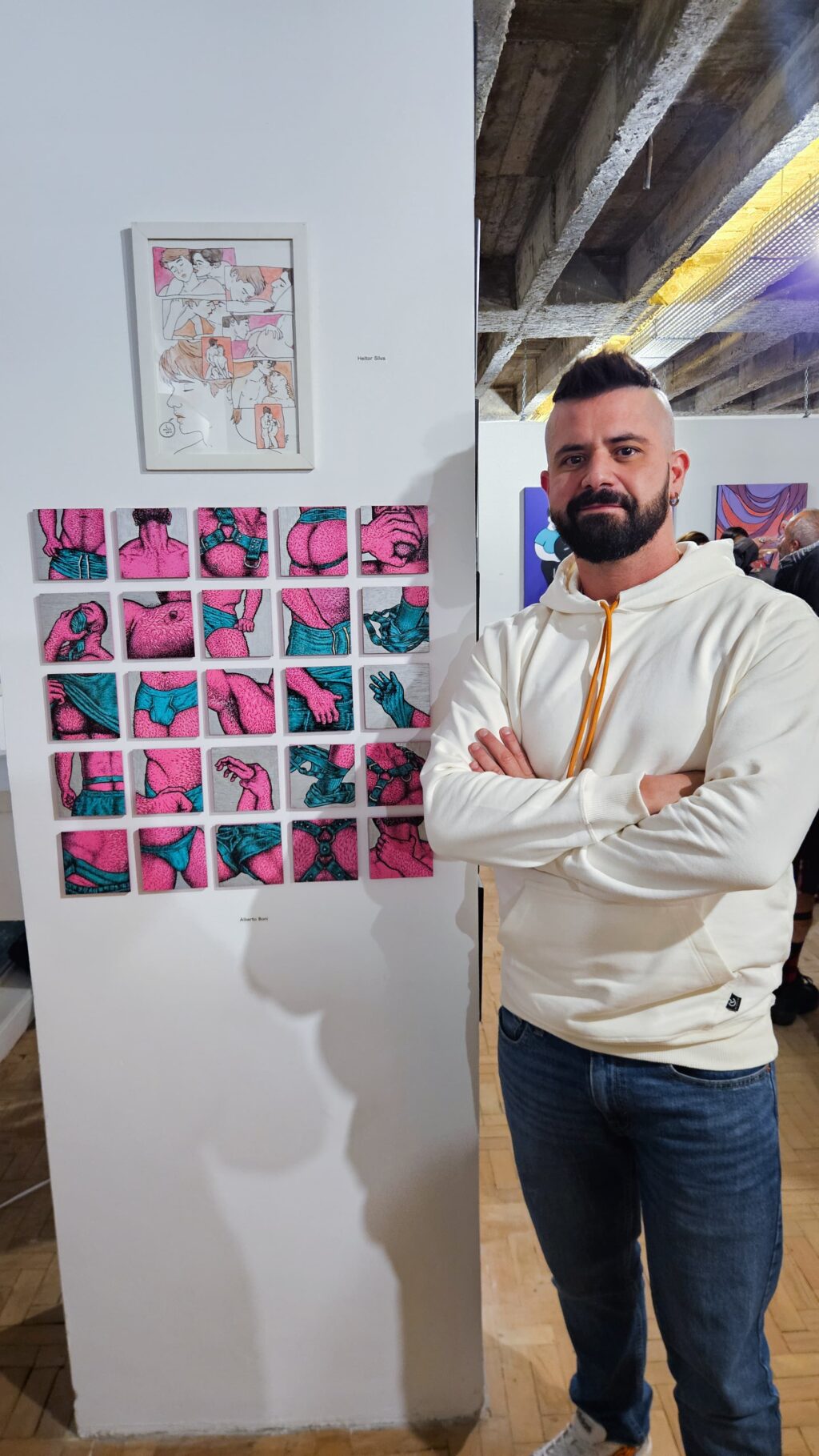 “A madeira me obriga a parar, tocar, sentir. Me cansei do digital. Precisava de algo mais real, mais tátil”, explica. O resultado é um mosaico intenso e colorido, em tons de rosa-choque, turquesa, laranja, que aborda o desejo masculino com franqueza, provocação e sensibilidade.