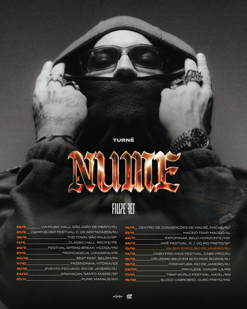 Depois de lançar Nume, um dos discos mais marcantes de sua carreira, seguido pelo recente lançamento de Nume Epílogo, a segunda parte do projeto, Filipe Ret se prepara para uma nova fase: a aguardada turnê do álbum, que percorrerá o Brasil a partir de agosto de 2025, no momento em que Ret se consolida como o rapper brasileiro mais ouvido de 2024 e 2025.
