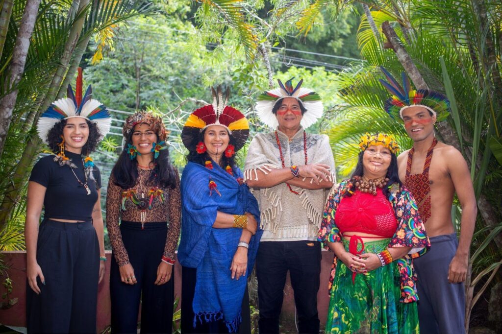O elenco indígena é formado por Maiara Astarte, Danilo Canindé, Lucia Tucuju e Mavi Santana, que levam ao palco a força da oralidade indígena, aliada à expressividade corporal e à vivência artística junto ao palco multimídia