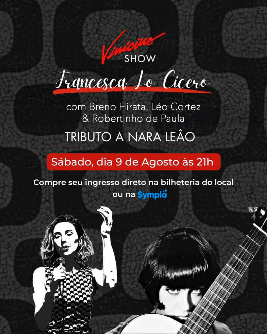 A cantora italiana Francesco Lo Cicero apresenta ao público um belíssimo show em homenagem à cantora Nara Leão. Conhecida pela voz doce e pelas posições firmes, Nara nunca fez concessões a quem queria etiquetar o seu cantar ou repertório debaixo de um rótulo. Da bossa nova e seus mais altos exponentes – Tom, Vinicius, Menescal e Carlos Lyra – até a Jovem Guarda – Erasmo e Roberto – passando pelos sambas de morro – Zé Keti e Cartola – até o feliz encontro com Chico Buarque, nesta noite especial Francesca vai percorrer a trajetória desta artista única que foi à vanguarda do seu tempo, edificou a figura feminina moderna fora de preconceitos antigos, assim como jogou luz sobre as sobras de uma sociedade plural e diversa e suas contradições. Francesca será acompanhada pelos músicos e parceiros Robertinho De Paula (violão de 7 cordas), Breno Hirata (sopros) e Léo Cortez (bateria),