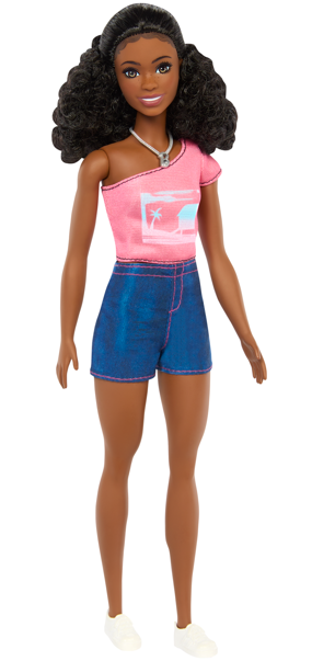 Com seu top rosa estampado e shorts jeans com costura rosa, Barbie “Brooklyn” está preparada para a ação. O look é complementado por tênis brancos e um colar icônico, reproduzindo fielmente o estilo da personagem na série. A boneca estimula a imaginação e amplia as possibilidades de brincadeira entre amigas.