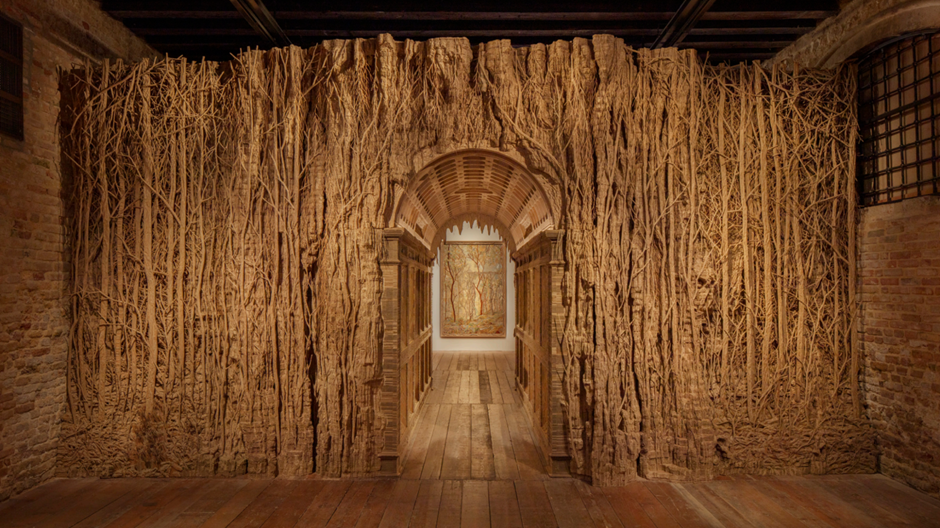 Destaque incontestável da 60ª Bienal de Veneza no Palazzo Pesaro degli Orfei, a instalação “Selva” traz um ambiente imersivo que recria uma floresta imaginária a partir de materiais como papelão, madeira e fibras naturais. Com árvores retorcidas, passagens labirínticas e estruturas que remetem a chalés de contos de fadas, a obra nos conduz por um universo que mistura fantasia, memória e ancestralidade. “Minha floresta é totalmente mental, não figurativa. Ela reflete preocupações humanas: a ideia de se perder ou se encontrar, nossa relação com a infância nos contos e nossos medos arcaicos… Minhas florestas são um refúgio para a fuga mental,” compartilha a artista.