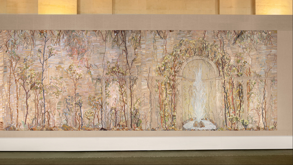 Outro destaque da exposição é a obra Chambre de Soie (2021–2024), painel monumental que envolve o espectador em uma experiência imersiva, onde natureza, arte e artesanato se entrelaçam em um jardim bucólico de tecidos. Cenário da coleção AW21 para a alta-costura da Maison Dior, a instalação de 3,5 metros de altura e 107 metros de comprimento é inteiramente composta por bordados feitos com 400 tonalidades de fios de seda, cânhamo, linho e algodão, produzidos manualmente pela Chanakya School of Craft, na Índia. Embora tenha ganhado projeção ao ocupar a Orangerie do Palácio de Versalhes, Chambre de Soie transcende o espaço histórico: trata-se de uma “sala-paisagem” que flutua entre o clássico e o contemporâneo, o minucioso e o grandioso — um testemunho da força poética e da visão singular da artista. A exposição conta ainda com outras 12 obras do repertório da artista.