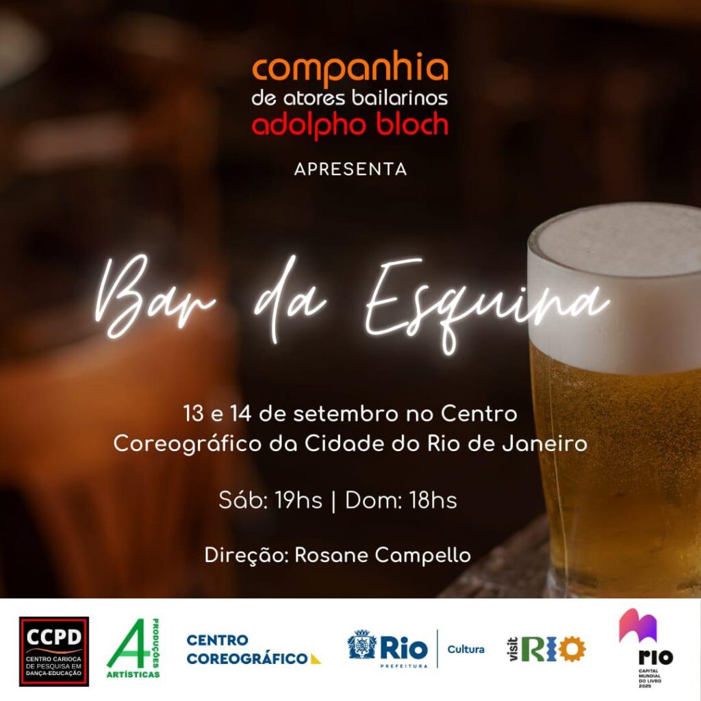 Com elenco selecionado para apresentações no México em outubro, a Cia de Atores Bailarinos Adolpho Bloch retorna aos palcos para apenas duas apresentações no Brasil antes da viagem internacional. Serão no Centro Coreográfico da Cidade do Rio de Janeiro, na Tijuca, com um dos seus espetáculos mais emblemáticos: “Bar da Esquina”. A programação especial acontece nos dias 13 e 14 de setembro, sábado, às 19h, e domingo, às 18h.