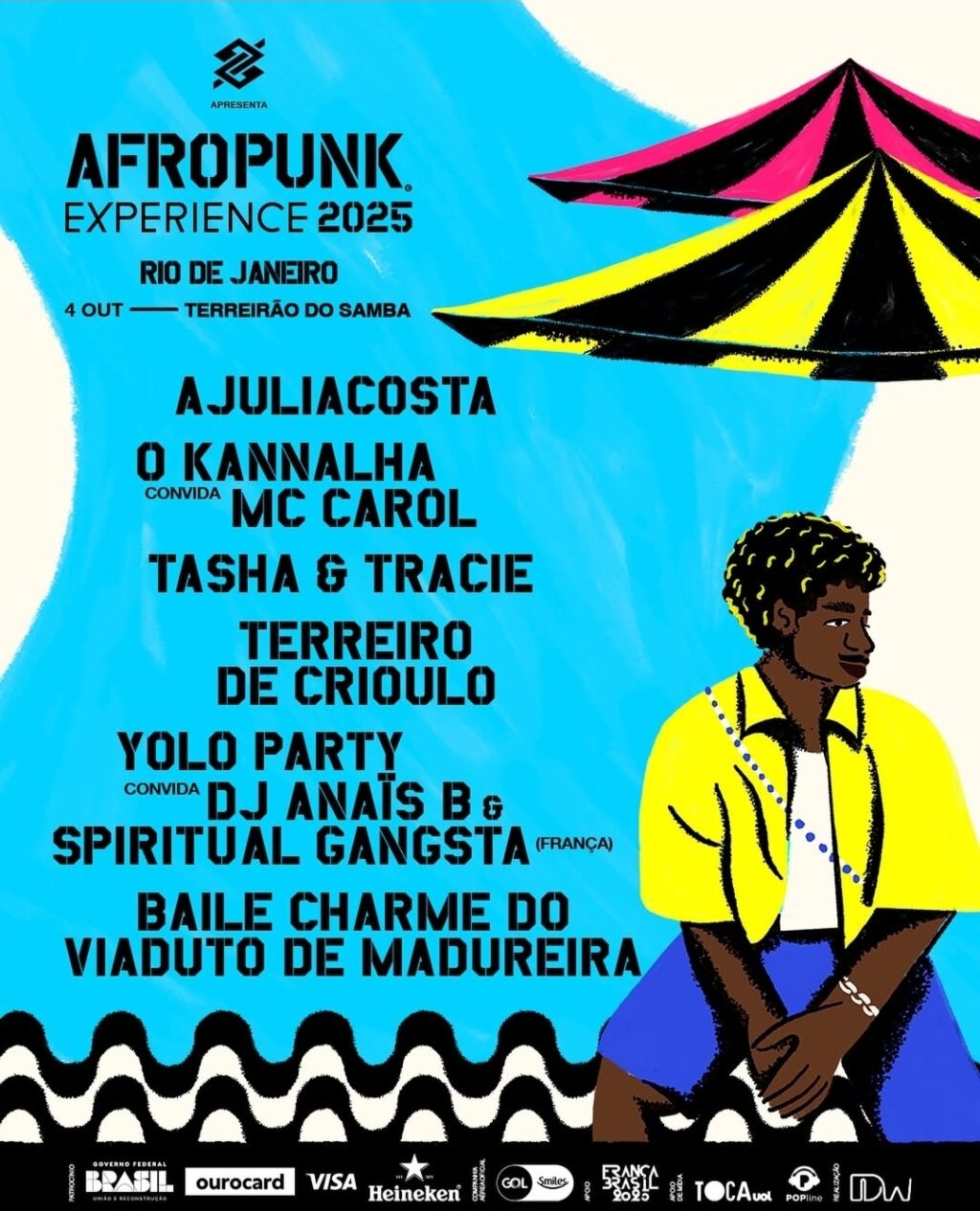 A nova edição do Experience conduz o público afropunker num esquenta que pegará fogo somente em novembro, na quinta edição do AFROPUNK Brasil. Este calendário teve início no Maranhão, em agosto, e chega agora ao Rio de Janeiro, em outubro, para encerrar 2025 nos dias 08 e 09 de novembro, em Salvador – com Tems, Coco Jones, Sister Nancy & BaianaSystem (em show inédito), BK’, Péricles, Liniker, ÀTTØØXXÁ, Budah, Núbia convida Muzenza, MC Luanna, Os Garotin, o show “40 anos da AFRO Axé Music: Tatau convida Marcia Short e Lazzo Matumbi”, além do encontro entre Budah e o rapper, compositor e produtor musical Wyclef Jean – nome emblemático do hip hop mundial e um dos integrantes do lendário grupo Fugees – e os DJs Boneka e Umiranda. O AFROPUNK Experience Rio de Janeiro conta com patrocínio master do Banco do Brasil, patrocínio da Heineken, Spotify como player oficial, e apoio da GOL Linhas Aéreas, companhia aérea oficial do evento.