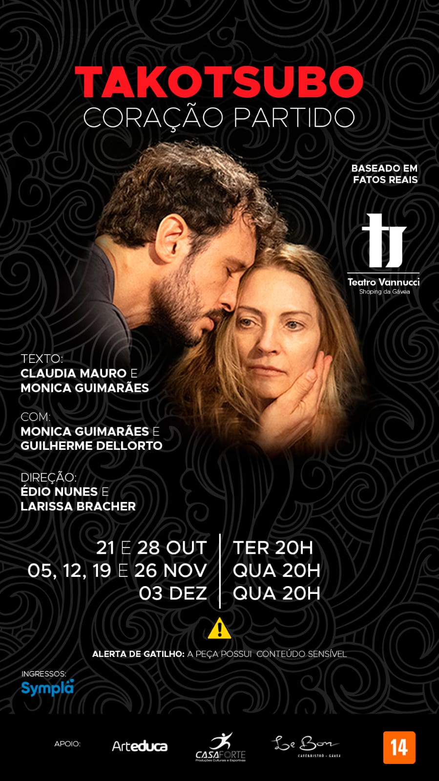“Takotsubo, Coração Partido” reestreia em sua terceira temporada e chega ao Teatro Vannucci, Shopping da Gávea, com sessões nos dias 21 e 28 de outubro, terças-feiras, às 20h, nas quartas de novembro e no dia 03 de dezembro, no mesmo horário.