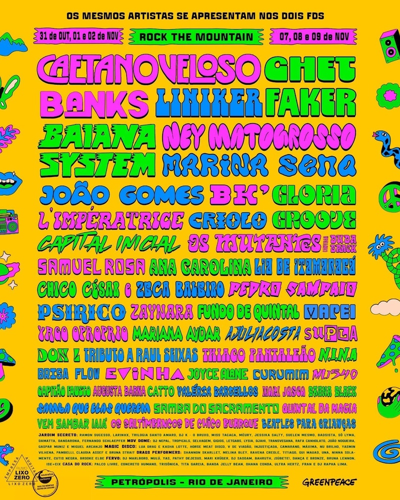 Com ingressos esgotados para os dois finais de semana, o Rock the Mountain promete seis dias de muita música boa em meio à natureza, com ações que vão ao encontro com a sustentabilidade e um espaço de alimentação vegetariana, com opções veganas e celíacas. Com programação espelhada, as sextas, sábados e domingos contarão com mais de 100 atrações por fim de semana. Grandes nomes da música brasileira vão marcar presença nos diversos palcos do evento, são eles: Caetano Veloso, Liniker, Banks, Chet Faker, Marina Sena, BK, João Gomes, Gloria Groove, Capital Inicial, Ana Carolina, Criolo, Psirico, Zaynara, Catto, Fundo de Quintal, Chico César e Zeca Baleiro, Pedro Sampaio, Mariana Aydar, Supla, entre outros.