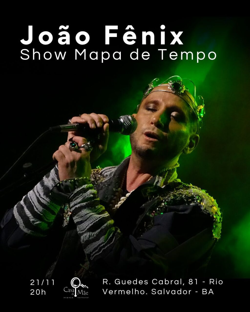 João Fênix desembarca em Salvador (BA), onde se apresenta no dia 21 de novembro, na charmosa Casa da Mãe, no bairro Rio Vermelho, onde o artista promete uma noite com muita emoção, beleza e a força da canção brasileira em sua forma mais genuína.