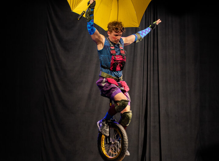 Com um número circense que combina garrafas de vidro, monociclo, bicicleta acrobática e cenas que desafiam a...