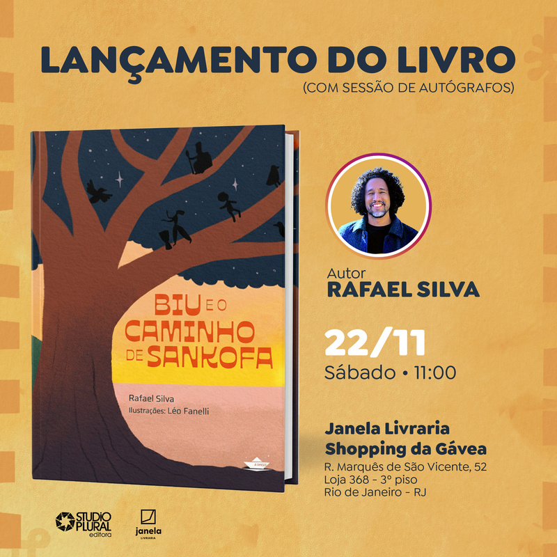 O escritor Rafael Silva lançará, no dia 22 de novembro, às 11h, o livro “Biu e o caminho de Sankofa”, ilustrado por Léo Fanelli e publicado pela Studio Plural Editora. O evento acontecerá na Janela Livraria, no Shopping da Gávea, no Rio de Janeiro, e contará com uma sessão de autógrafos.