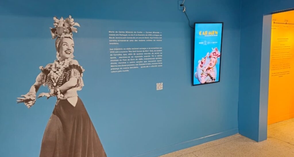 Com curadoria da equipe do Museu Carmen Miranda, a exposição apresenta figurinos icônicos usados por Carmen no cinema, incluindo peças recriadas de filmes como “Banana da Terra” (1939) e “Serenata Tropical” (1940), além do traje utilizado na histórica apresentação do Cassino da Urca. Fotografias, discos, revistas, partituras e objetos originais também compõem o percurso expositivo, oferecendo ao visitante um panorama afetivo e artístico da carreira da cantora.