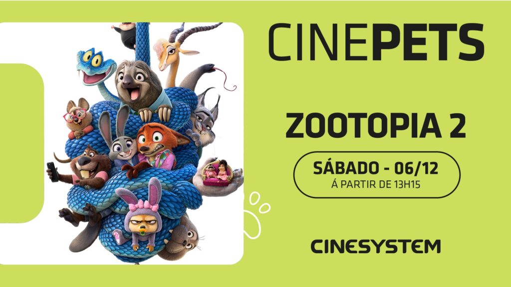 Na última semana um fenômeno ocorrido na China ganhou as manchetes do mundo: milhares de pessoas comparecendo aos cinemas para assistir Zootopia 2 ao lado de companheiros muito especiais: seus cachorros de estimação. As sessões especiais fizeram sucesso e ajudaram para que o longa se tornasse a maior bilheteria de filme estrangeiro de todos os tempos no país. E por aqui, a ação também vai acontecer! Isso porque a Cinesystem, que figura entre as cinco maiores exibidoras do Brasil, vai realizar neste sábado (06) o Cine Pets, projeto criado pela rede que proporciona sessões periódicas de cinema adaptadas para que cães e humanos possam aproveitar um filme juntos.
