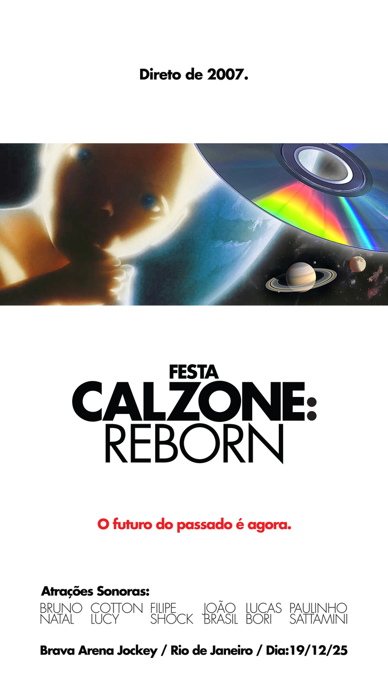 Uma das festas que agitou o Rio de Janeiro durante muitos anos está de volta com uma edição especial. No dia 19 de dezembro, sexta-feira, a Brava Arena Jockey recebe a CALZONE: Reborn. Comandando o som estão os seis amigos que lá atrás se juntaram para causar: Bruno Natal, Cotton Lucy, Filipi Shock, João Brasil, Lucas Bori e Paulinho Sattamini.