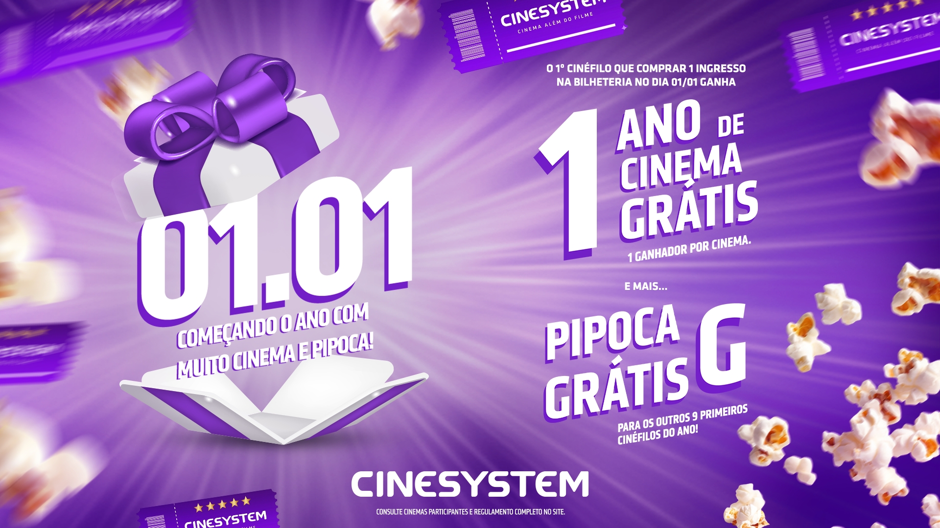Os clientes que quiserem participar da campanha precisam acessar ao site da exibidora (www.cinesystem.com.br) e conferir a lista de cinemas que estarão em operação no dia 01 de janeiro. Após isso, basta comparecer ao multiplex da Cinesystem mais próximo. Todos os cinemas participantes irão entregar 01 ano de cinema grátis para o primeiro comprador e 09 vouchers de 01 ano de pipoca grande grátis para os seguintes. Para os cinemas que não funcionarem no dia 01, a promoção será válida no dia 02 de janeiro!