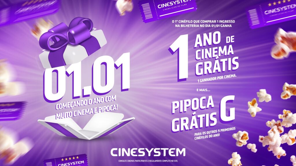 As estreias previstas para 2026 estão deixando muitos cinéfilos ansiosos! De “Toy Story 5” a “Jogos Vorazes: Amanhecer na Colheita”, passando por “O Diabo Veste Prada 2” e “Vingadores: Doomsday”, são muitos títulos que prometem fazer a cabeça de pessoas de todas as idades e a Cinesystem, que figura entre as maiores exibidoras do país, decidiu preparar uma surpresa que vai deixar o próximo ano ainda mais interessante! O primeiro cliente de cada cinema a realizar a compra de pelo menos 1 ingresso presencialmente no caixa, no dia 01 de janeiro de 2026, vai ganhar um ano de cinema grátis! E não para por aí. Os 9 clientes subsequentes, por cinema, que efetuarem a compra vão poder aproveitar um ano de Pipoca Grande totalmente na faixa.