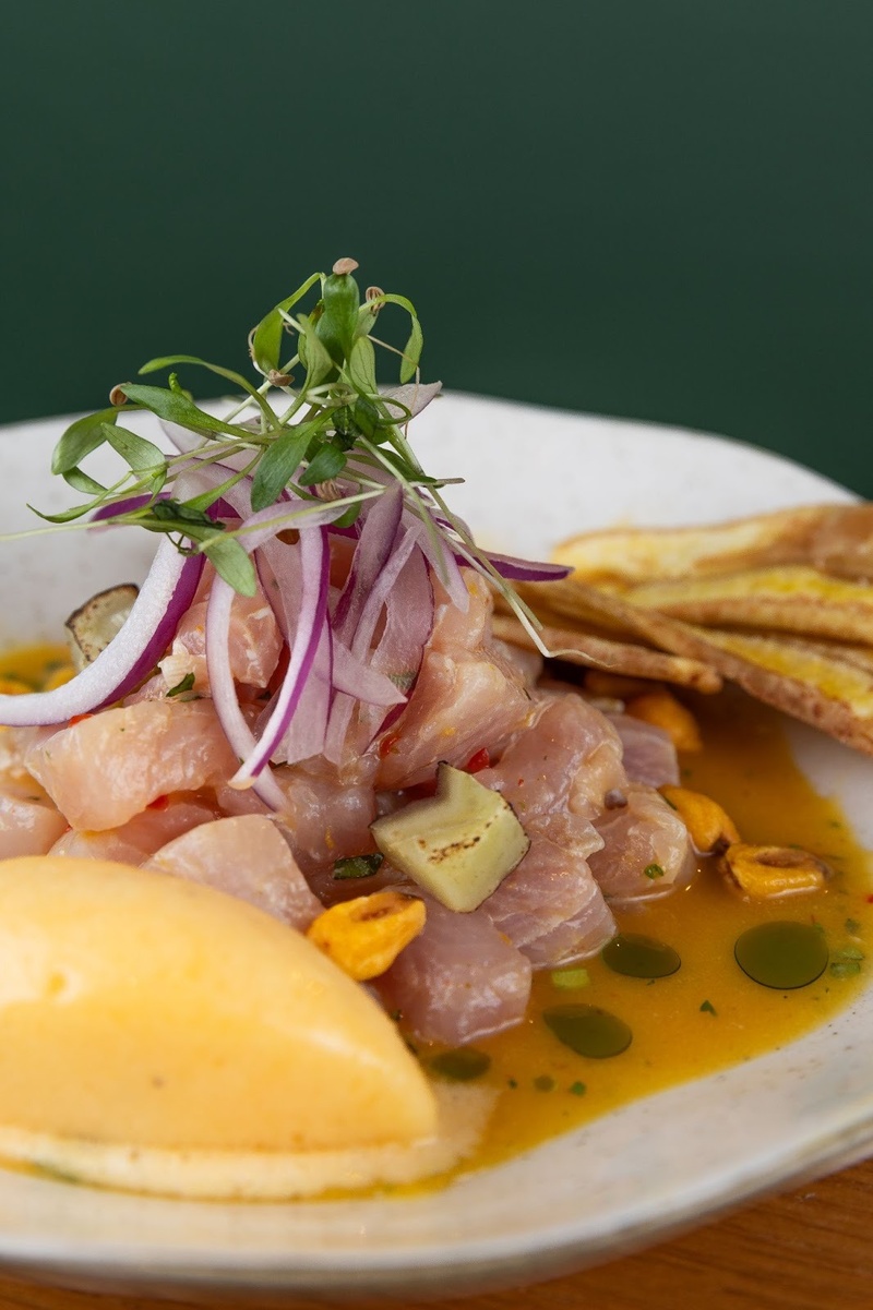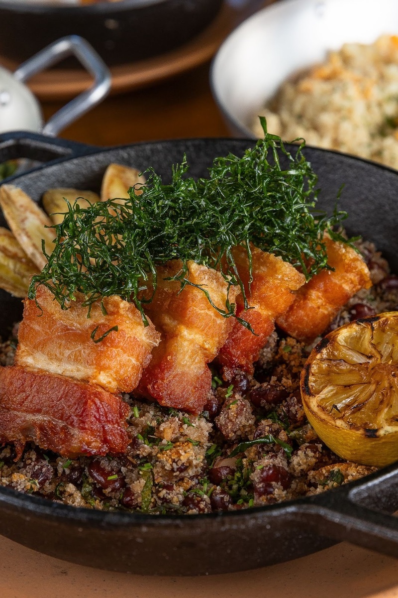 A proposta gastronômica do espaço combina ingredientes nativos, técnicas tradicionais e interpretações contemporâneas que celebram a diversidade e a afetividade da culinária brasileira. Nas entradas, o público encontra releituras como o Ceviche da Amazônia, marcado pela acidez e pelo tempero da região, e o pão de queijo com linguiça, que resgata o sabor mineiro. Entre os principais, destacam-se o Picadinho de Mignon, preparado em uma releitura que traduz afeto e tradição, o Bobó de Camarão, cremoso e aromático, que homenageia a força da culinária afro-brasileira, além de opções veganas. As sobremesas encerram a experiência com memórias afetivas: a cocada cremosa, típica do Nordeste, e a torta Romeu e Julieta, que exalta o encontro perfeito entre queijo e goiabada.