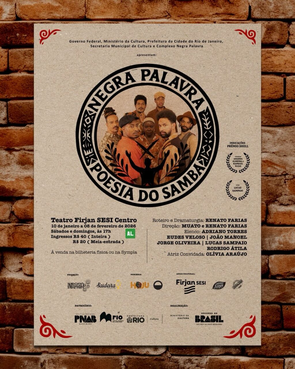 Cantados há mais de um século em terreiros, rodas, escolas de samba, ruas e avenidas, os sambas acompanham o cotidiano brasileiro, traduzindo não apenas a resistência da população negra, como também uma forma nacional de festejar, amar e estar no mundo. Em “Poesia do Samba” o Complexo Negra Palavra joga luz sobre uma certeza: todo samba é, antes de tudo, um poema vivo. Ao deslocar as letras do canto para a palavra falada, o espetáculo evidencia a sofisticação literária do gênero e reafirma o samba como uma das mais importantes expressões da poesia popular brasileira. A montagem fica em cartaz até dia 08 de fevereiro no Teatro Firjan Sesi Centro.