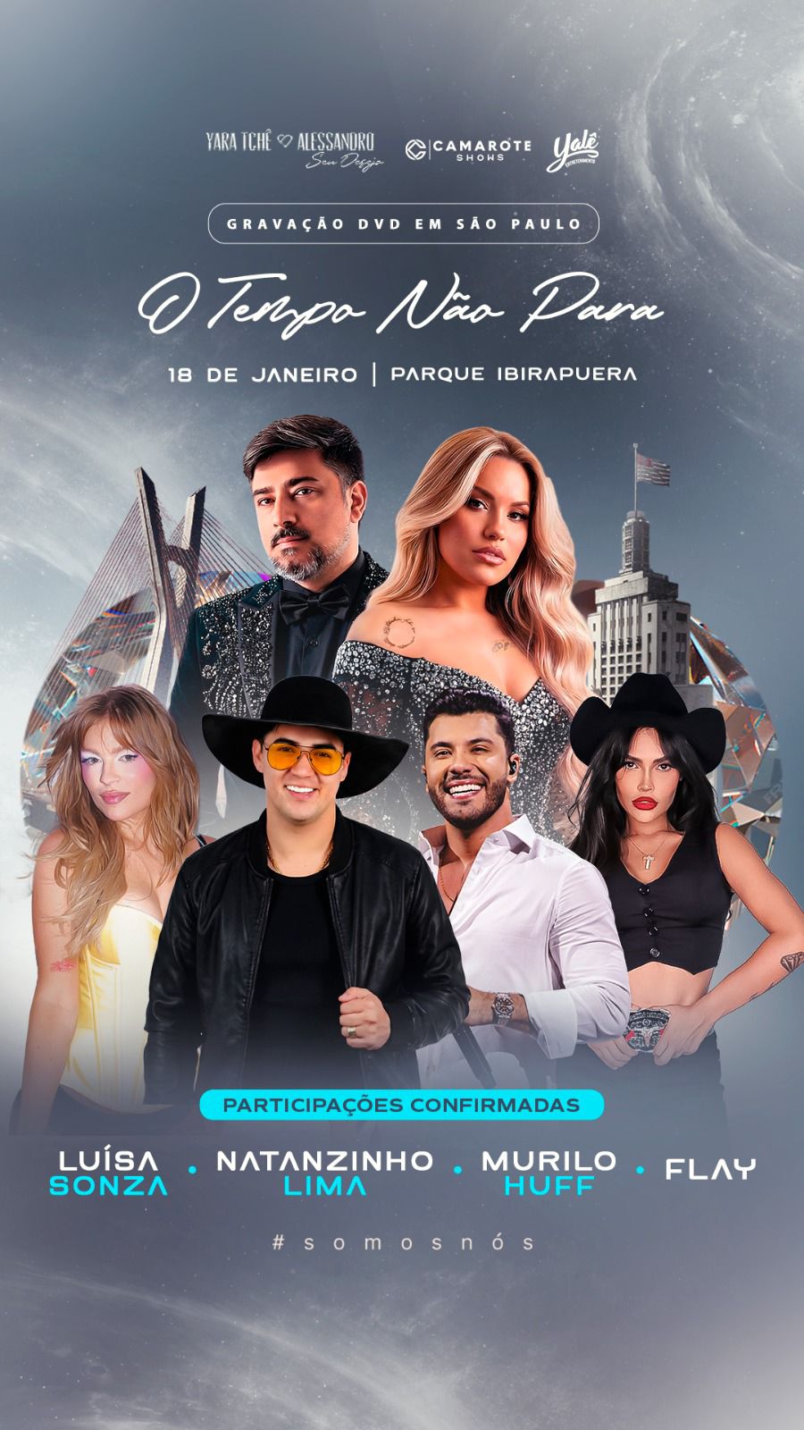 Neste domingo, 18 de janeiro, Yara Tchê e Alessandro, à frente da banda Seu Desejo, gravam o DVD “O Tempo Não Para” em São Paulo. O projeto será registrado no Parque Ibirapuera, reunindo fãs para uma noite especial marcada por emoção, encontros musicais e a celebração do forró romântico. Os ingressos foram distribuídos gratuitamente e já estão esgotados.