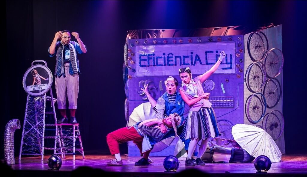 A encenação combina teatro, dança e circo, marcas da trajetória da Cia Móvel de Teatro, criando imagens poéticas que dialogam diretamente com crianças e adultos.