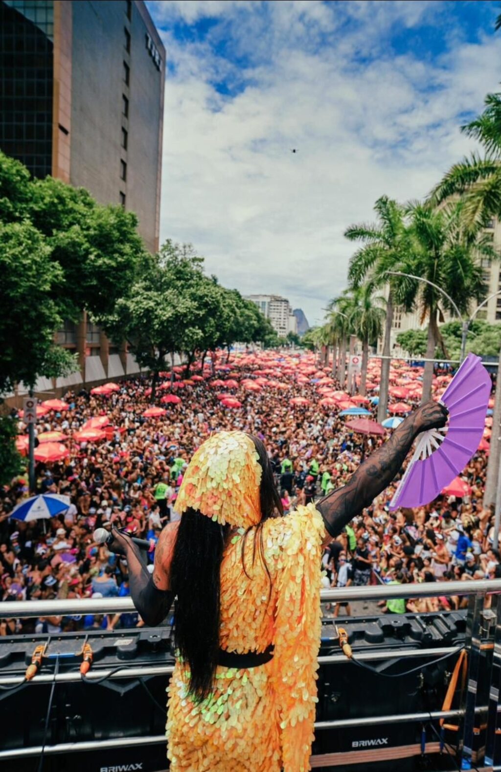 Durante o desfile, Grag também promoveu uma ação especial com o público, com a distribuição de leques próximos ao trio, em diálogo com a energia e a estética da Era Cósmica.