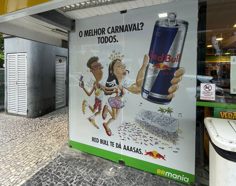 Já em parceria com a Red Bull, realiza uma ativação especial no formato de loja emblemática, com ambientação diferenciada e forte presença visual da marca. Na unidade da Rua Rui Barbosa, no Flamengo, a loja se transforma em um circuito temático de Carnaval, guiado por adesivos de chão que conduzem o consumidor por diferentes pontos de destaque, incluindo gôndolas e geladeiras exclusivas da Red Bull — além de uma super cabine de glitter instagramável, ambientação de fachada e vitrines, reforçando a experiência no ponto de venda.
