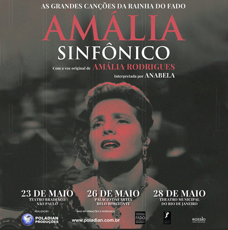 A turnê brasileira de Amália Rodrigues Sinfônico tem início em São Paulo, no dia 23 de MAIO, no Teatro Bradesco, seguindo para Belo Horizonte, onde será apresentado no Palácio das Artes em 26 de MAIO, e encerrando essa jornada no Rio de Janeiro, no histórico Theatro Municipal, em 28 de MAIO.