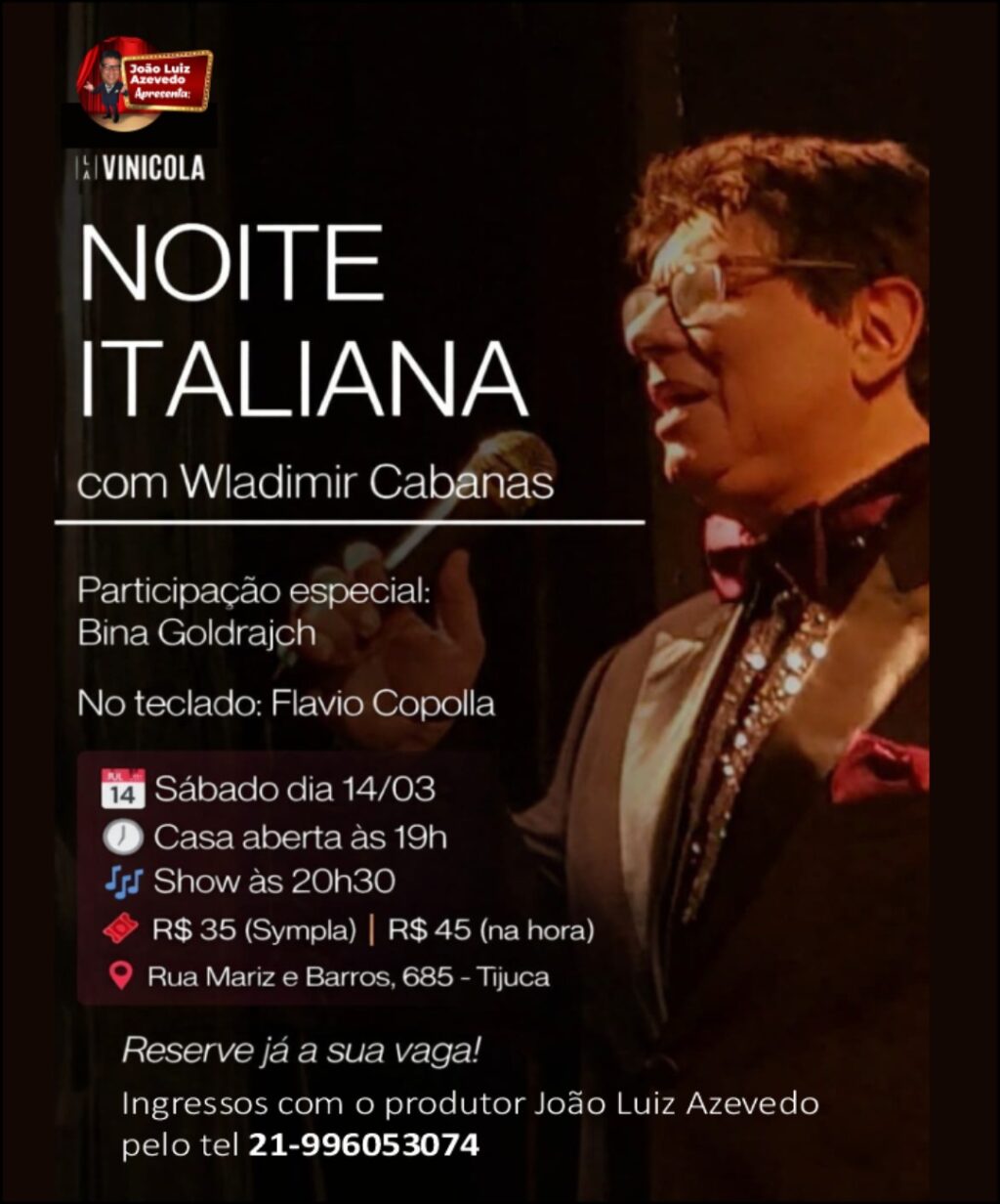 O LA VINÍCOLA , situada na Rua Mariz e Barros, 685 – Tijuca/RJ Tijuca e o produtor João Luiz Azevedo têm o prazer em apresentarem o show NOITE ITALIANA com o tenor do Theatro Municipal do RJ, WLADIMIR CABANAS em homenagem ao vasto repertório de grandes intérpretes da música italiana, como Pepino di Capri, Andrea Bocelli, Luciano Pavarotti, Lucio Dalla, Jimmi Fontana, Gigliotta Cinqueti, Emilio Pericoli, Giannini Morandi e Laura Pausini … onde apresentará sucessos desses gigantes da Música mundial como “La Donna è Mobili” , “Nessum Dorma”, “Champagne”, “Caruso”, “Conta te partiro”, “BElla Tchaw”, “Dio Comme Ti Amo”, “Tormento D’amore”, “Core ingrato”, “o Sole Mio”, ‘Paria piu piano”, “Volare” entre muitas outras…