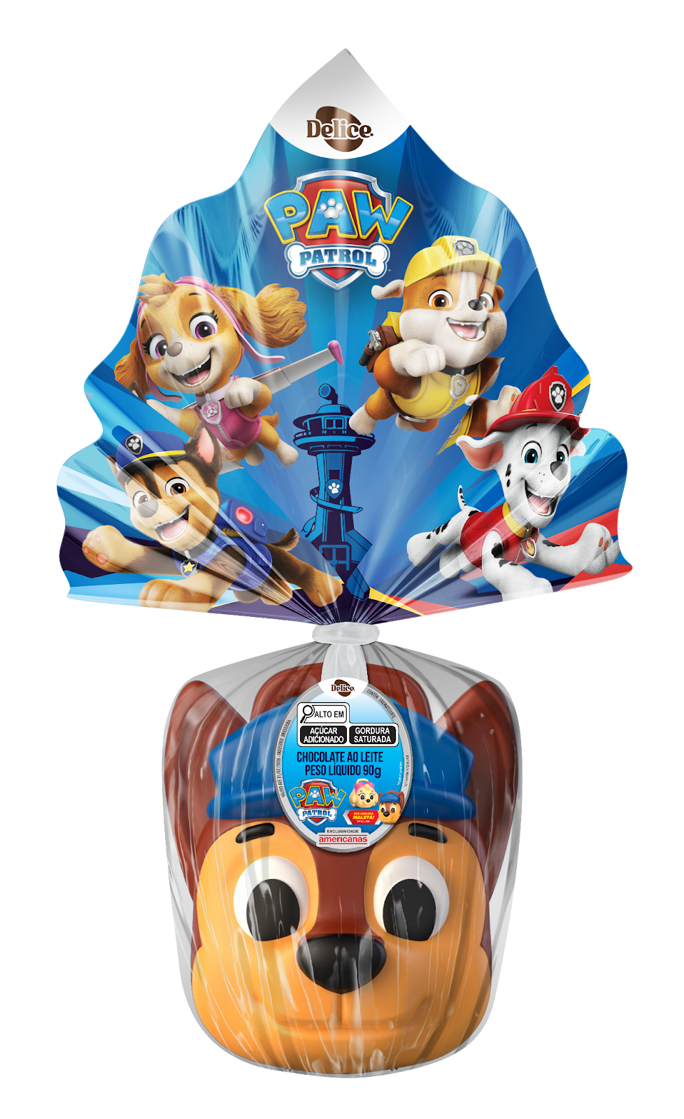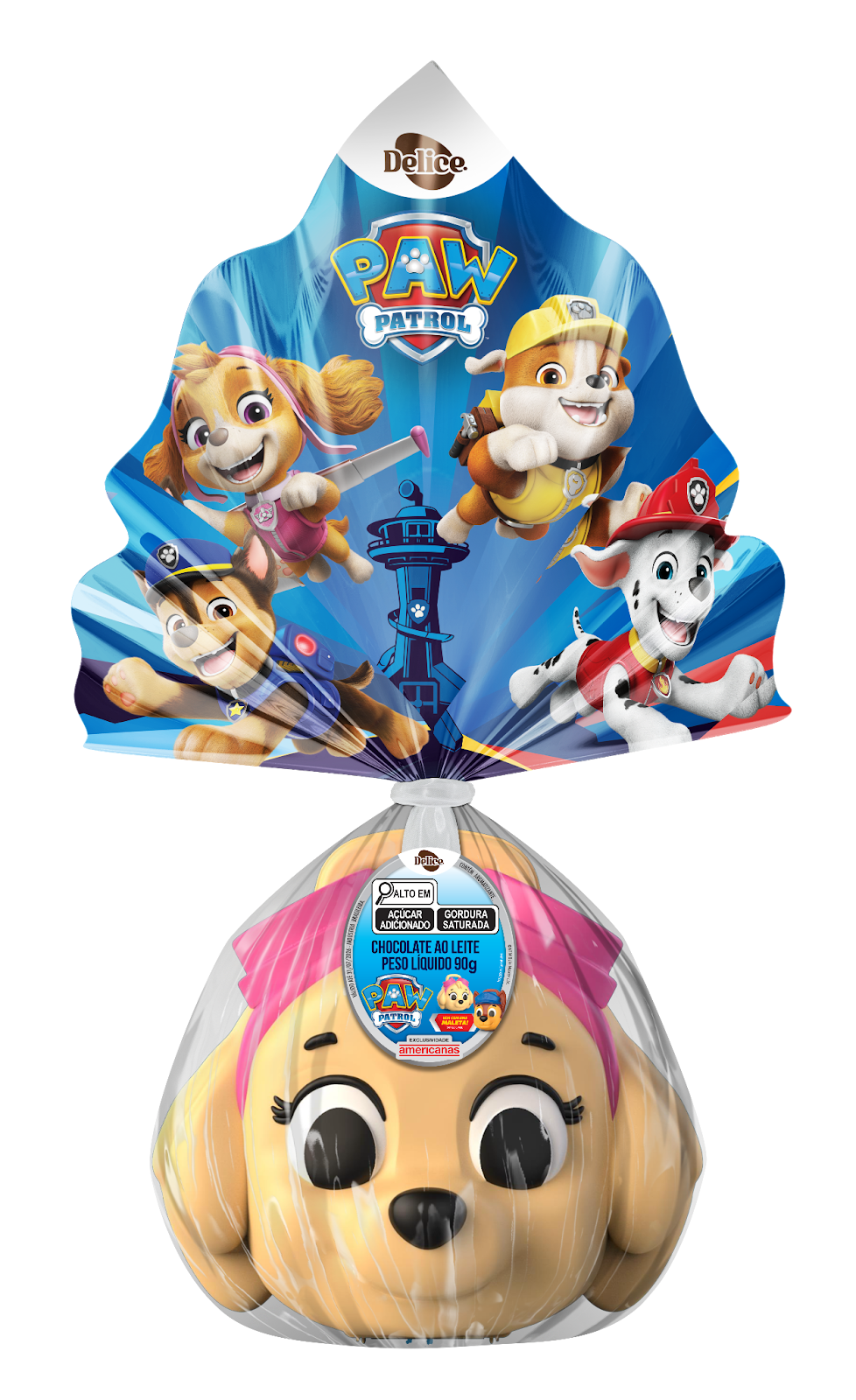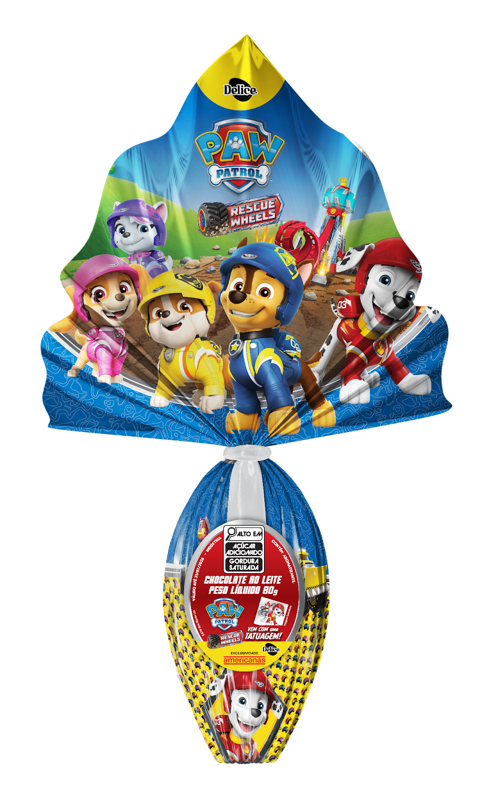 Ovo de chocolate ao leite. Acompanha uma cartela de tatuagens temporárias da Patrulha Canina.