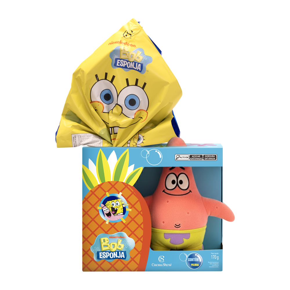 Ovo de chocolate ao leite com drageados crocantes ao leite. Acompanha uma pelúcia do personagem Bob Esponja ou Patrick.