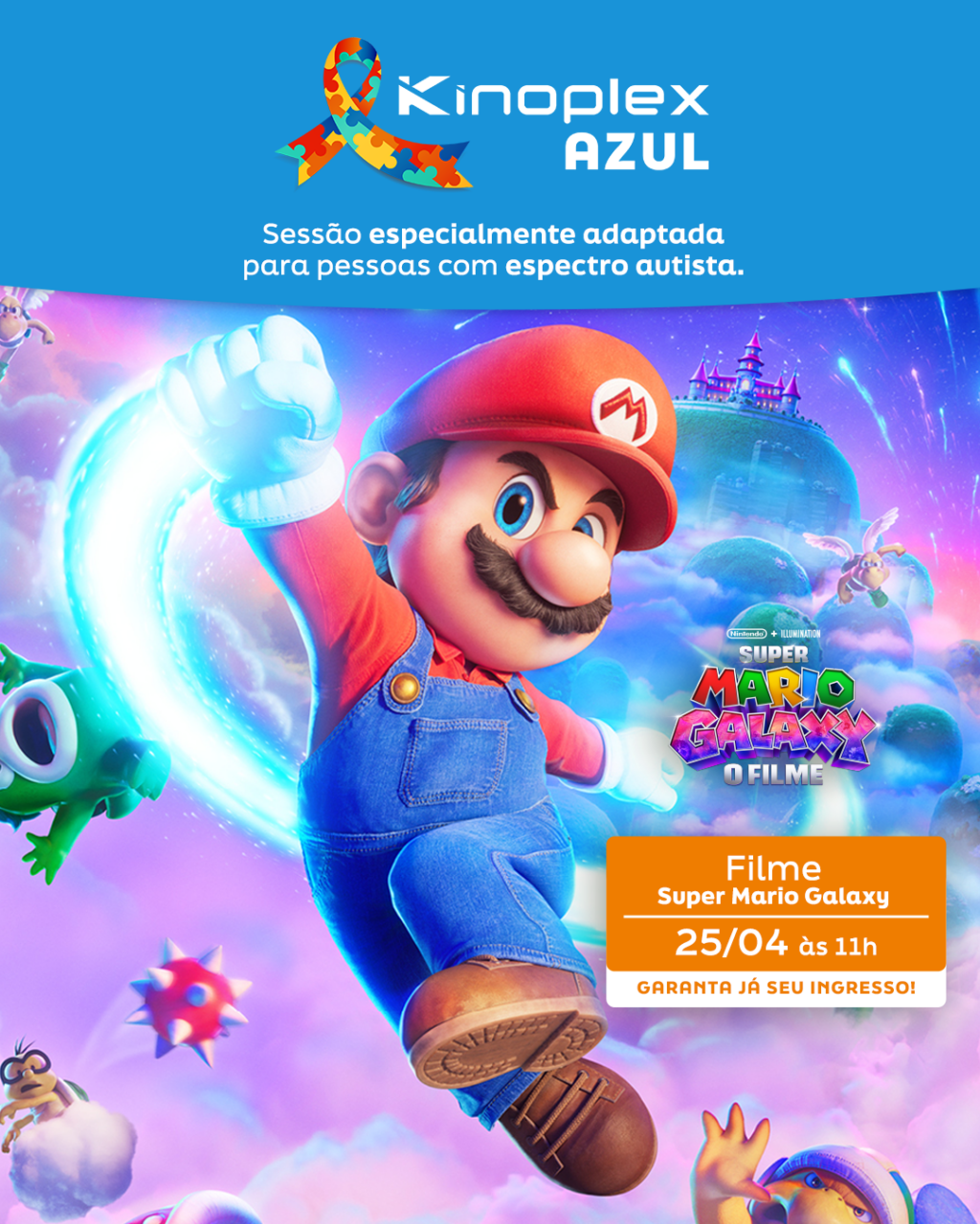 No próximo dia 25 de abril (sábado), às 11h, crianças e adolescentes no espectro autista e suas famílias terão a oportunidade de assistir ao filme ‘Super Mario Galaxy”.
